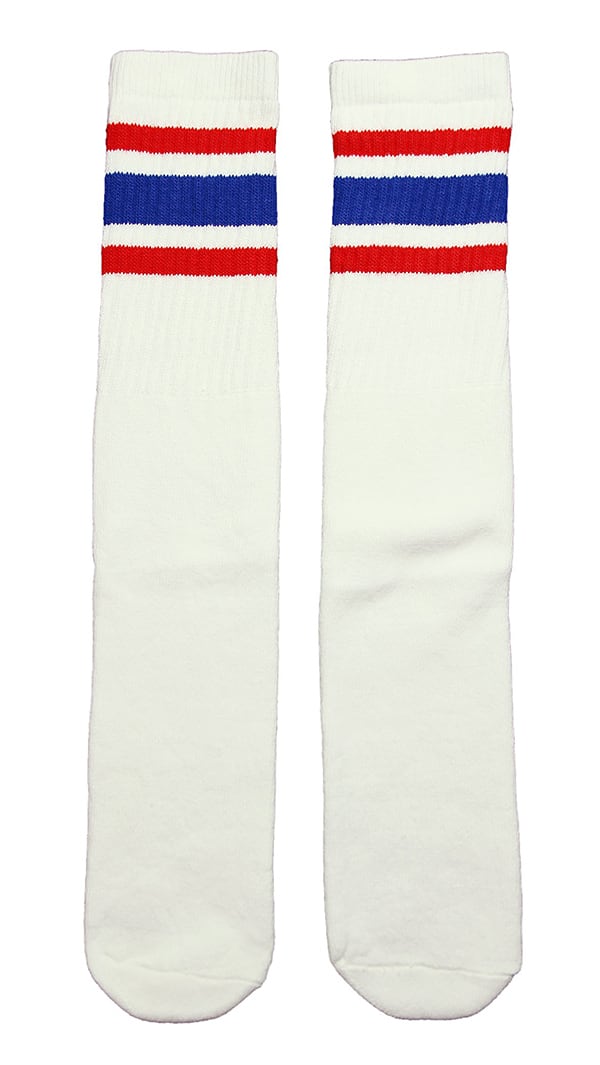 SkaterSocks (スケーターソックス) 22インチ ロング チューブソックス 靴下 US MADE 70年代 アメリカ製 スケートボード スケボー オールドスクール(ホワイト×レッド×ブルー)Knee high White tube socks with Red-Royal Blue stripes style 3