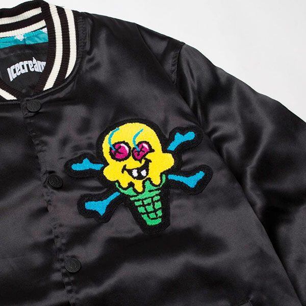 ICECREAM(アイスクリーム)スタジャン サテンジャケット ジャンパー Bones Jacket Black(Pharrell Williams ファレル・ウィリアムス)スケボー SKATE SK8 スケートボード HARD CORE PUNK ハードコア パンク HIPHOP ヒップホップ SURF サーフ レゲエ reggae スノボー